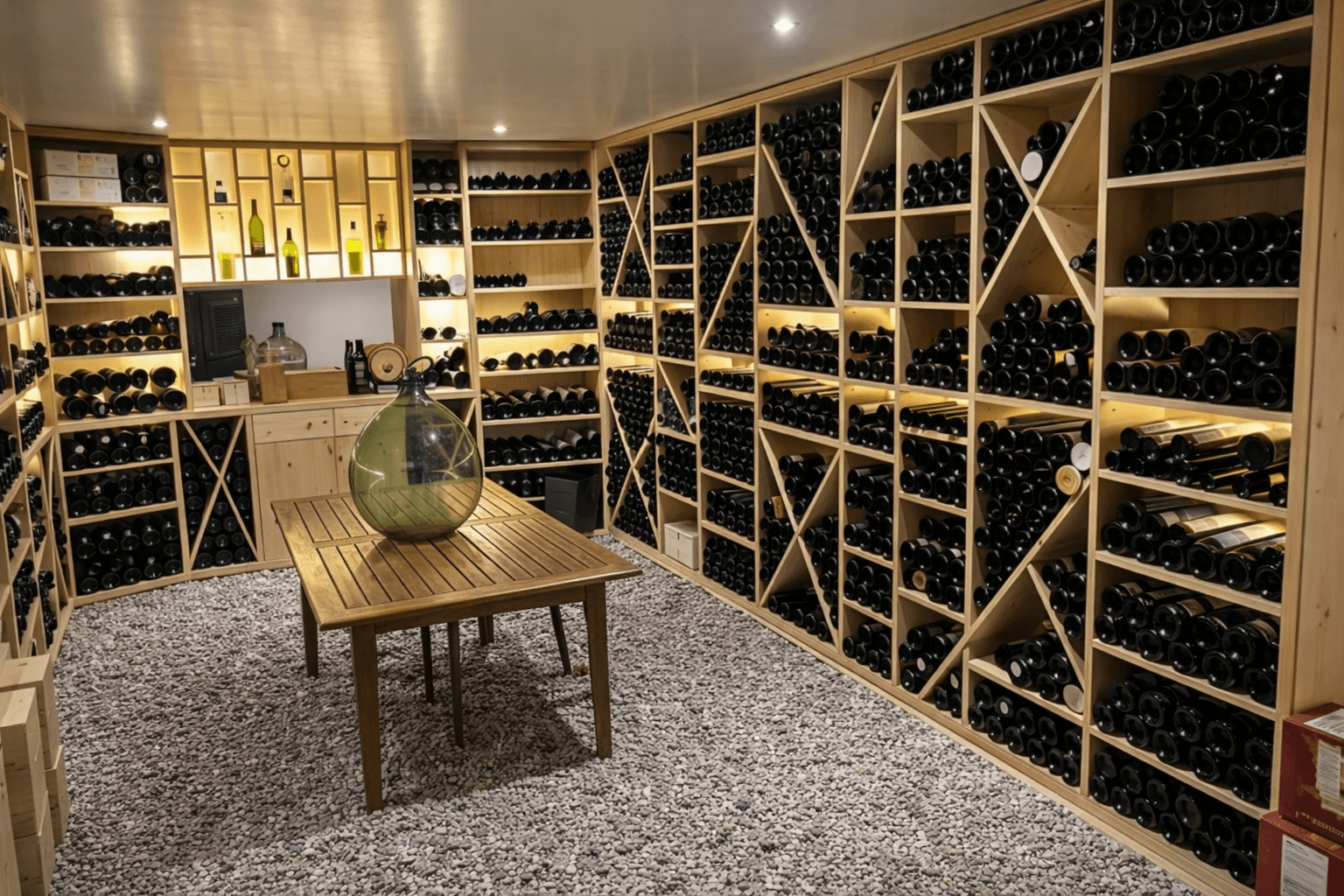 Fabrication et installation d’un ensemble de rangements en bois dédié au stockage du vin. Réalisation de casiers, niches et modules adaptés afin d’optimiser la capacité de stockage tout en structurant l’espace.